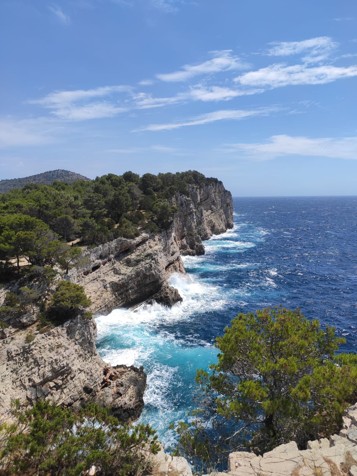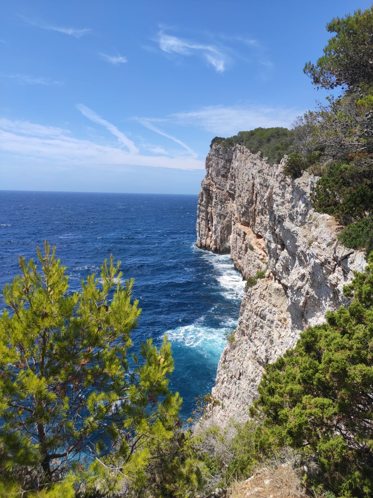 Gestern, am Freitag, wehte schon morgens ein sehr frischer Wind von ca 20kn, so dass wir beschlossen, unsere kleine Bucht auf Zut noch vor dem Frühstück zu verlassen und mit Motor in den Telascica Nationalpark im Süden der Insel Dugi Otok zu fahren, wo wir den Tag in der scheinbar geschützten Bucht verbringen wollten. Nach der Frühstückspause am Nordufer der Telascica Bucht hatte der Wind dann schon so weit zugenommen, dass sich selbst in der Bucht ein ordentlicher Schwell aufgebaut hatte und die Böen von bis zu 8 Windstärken unser Boot selbst ohne Segel zur Krängung brachten. Wir überquerten die Bucht und legten uns am Südufer in das zum Nationalpark gehörige Muringfeld. Dort baumelte die Sprotte dann wie in einer Mischung aus Achterbahn und Kettenkarussell an der Boje. Zum Glück hat alles gehalten. Die Überfahrt mit unserem Minischlauchboot zum Land war auch sehr abenteuerlich und vor allem nass. Die Wanderung zu den Steilklippen und zum Salzsee dafür umso schöner :-)