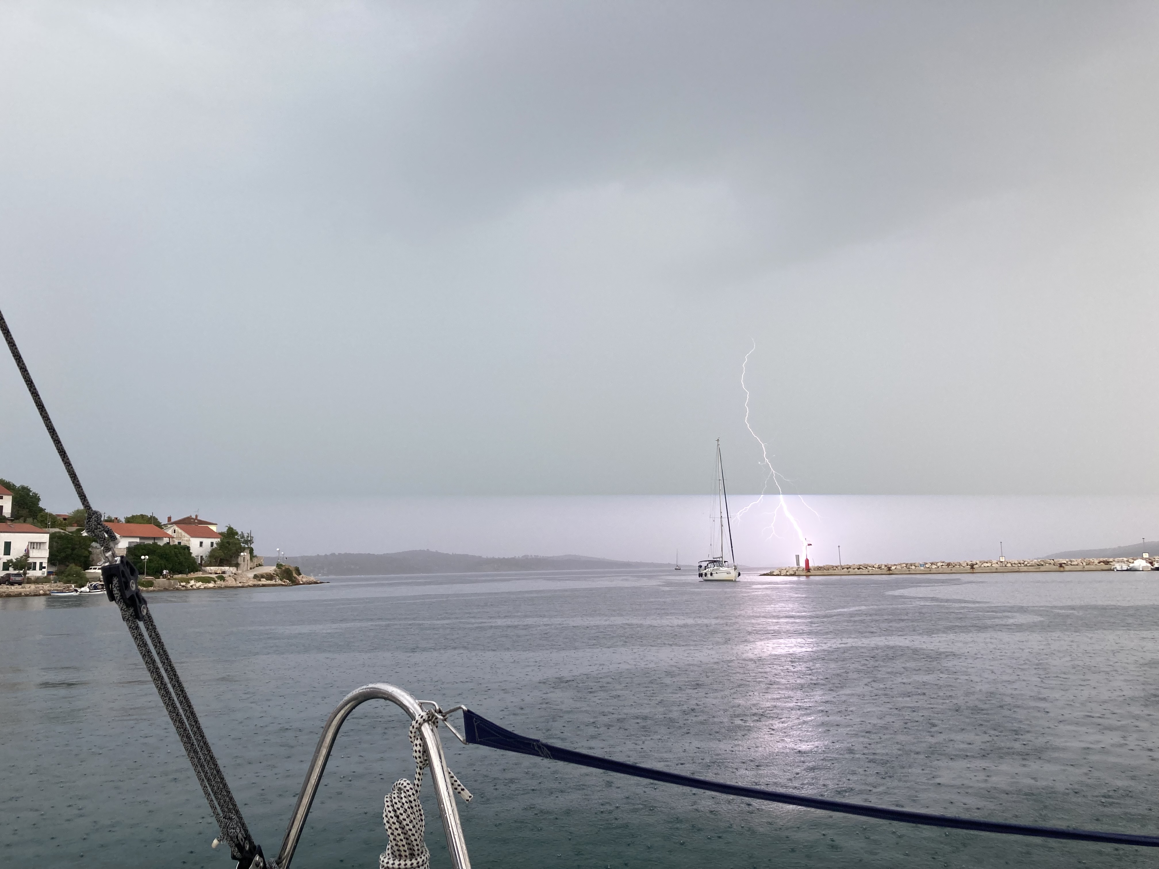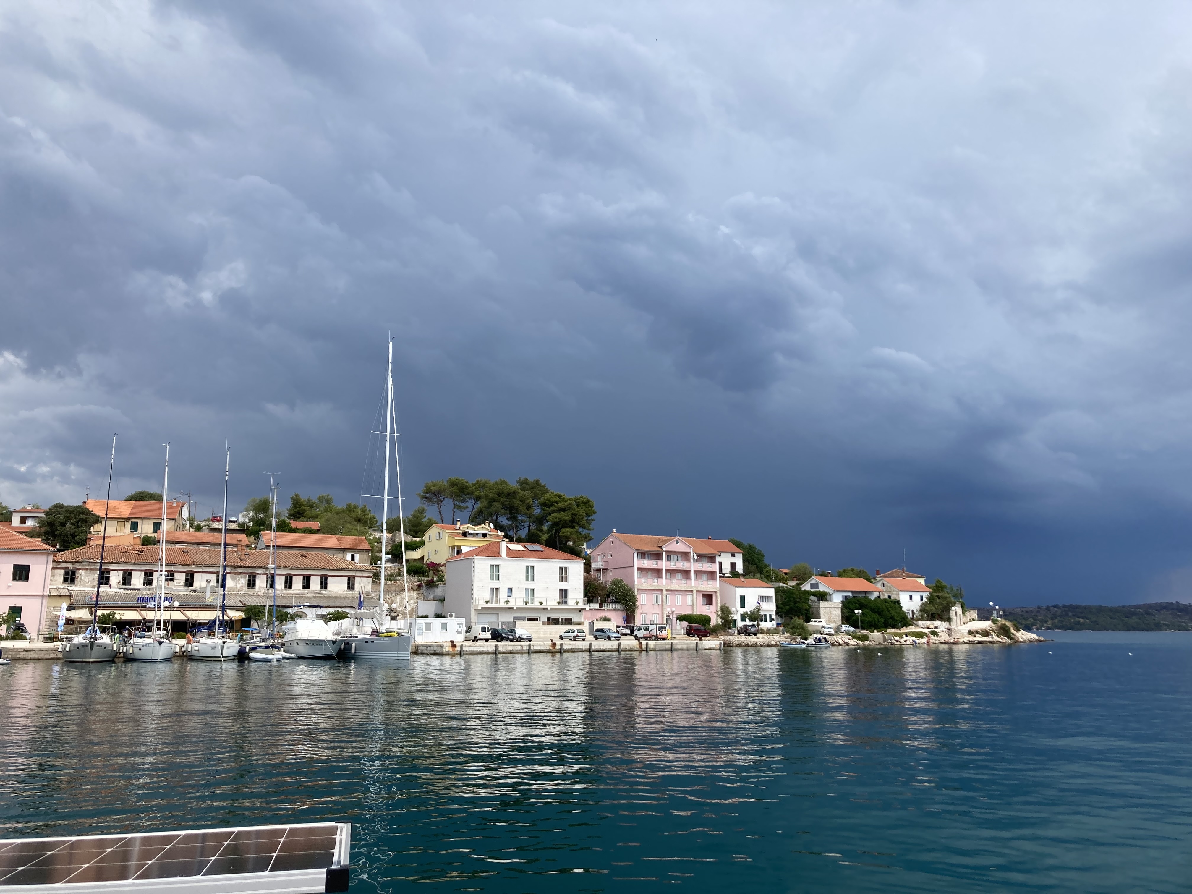 Als wir zurück kamen, hatte sich der Wind wieder etwas beruhigt. Und weil für den nächsten Morgen wieder Bora und auch Gewitter angesagt waren, entschieden wir noch am Abend in den nächsten richtigen Hafen in Sali (Nordseite von Dugi Otok) zu fahren. Die Telascica Bucht ist ganz offensichtlich nicht geschützt bei Bora...