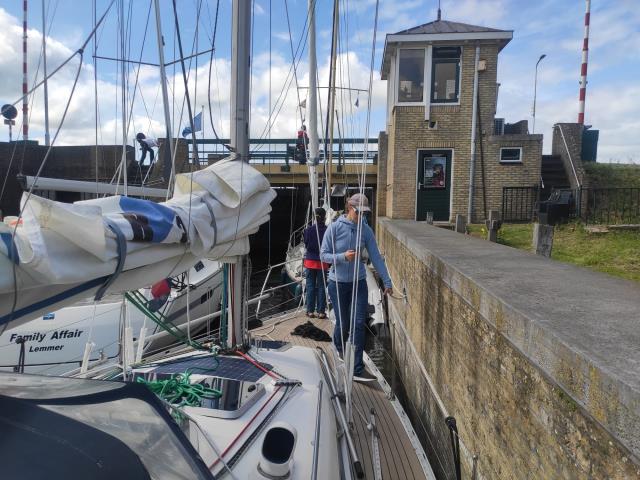 Workum Schleuse. Unsere erste Schleuse in Holland. Schleusengeld (5€) wurde wieder per Holzschuh bezahlt.