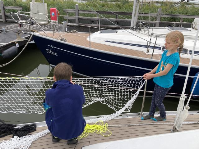 In den kurzen Regenpausen haben die Kinder das Relingnetz befestigt.