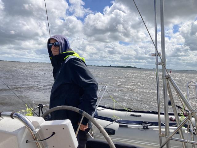 Fahrt über das Lauwersmeer. Sonne und Regen wechseln sich bei 7 Windstärken ab.