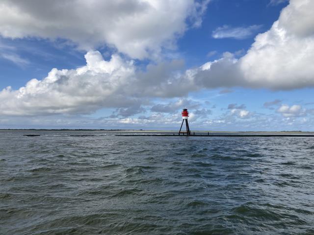Zuhalten auf die Einfahrt nach Borkum. Im Hintergrund sieht man schon die Einfahrtsmarkierung, die berühmte Fischerbalje.