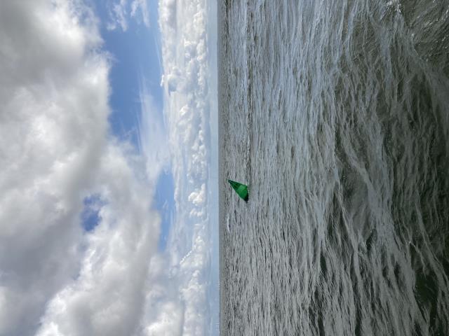 Hier noch mal die Tonne. Der Gegenstrom beträgt ca 5 km/h. Da muss man mit Motor und Segel gegenhalten.