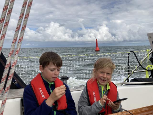 Die Stimmung bei den Kindern ist gut. Der Seegang ist trotz Strom gegen Wind nicht zu stark.