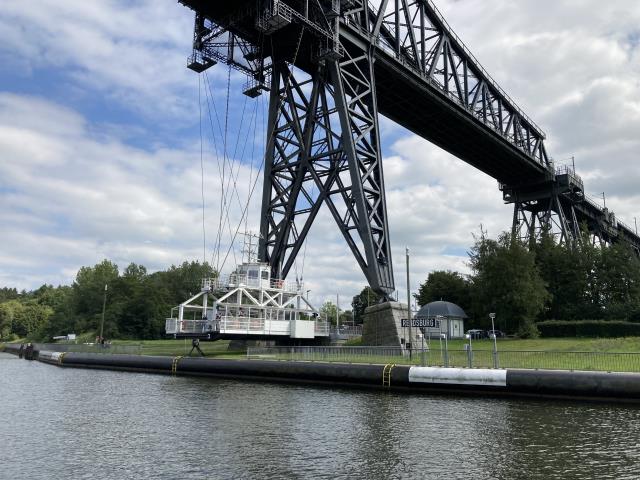 Ein Highlight auf der Strecke: Die Schwebefähre bei Rendsburg. Menschen und Autos werden durch die Luft hängend zur anderen Seite transportiert.