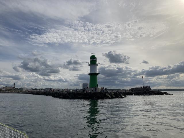 Irgendwann schlief der Wind ein - aber die Sonne blieb und wir konnten das erste Mal in diesem Urlaub vom Boot aus Baden gehen. Mitten auf der Ostsee :-) Für die restliche Strecke bis Warnemünde mussten wir dann leider doch wieder den Motor zu Hilfe nehmen. Fast 8 Stunden waren wir für die 65 km von Fehmarn bis Warnemünde unterwegs. Den Abend verbrachten wir dann im Getümmel am Alten Strom und am Strand.