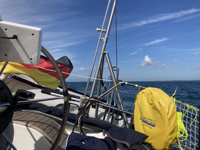 Wir konnten unser Glück gar nicht fassen! Heute morgen gab es Sonnenschein UND Wind aus der richtigen Richtung mit angenehmen 12-15 Knoten. Zumindest für die erste Hälfte unseres Törns bis nach Warnemünde. Bis zu 13,5 km/h hat unser Log angezeigt. Das war ein wirklich berauschendes Gefühl :-)