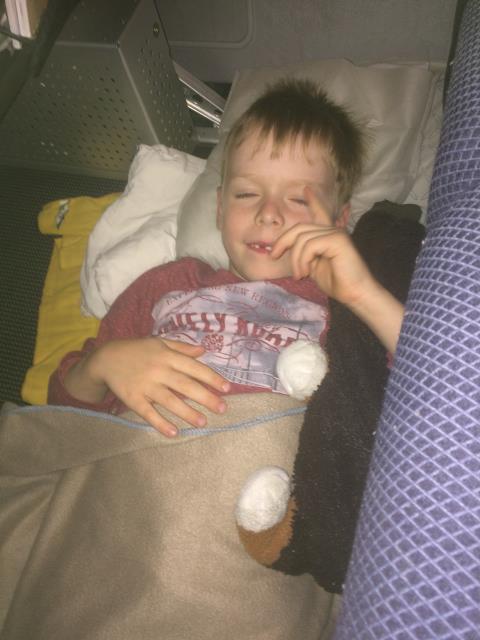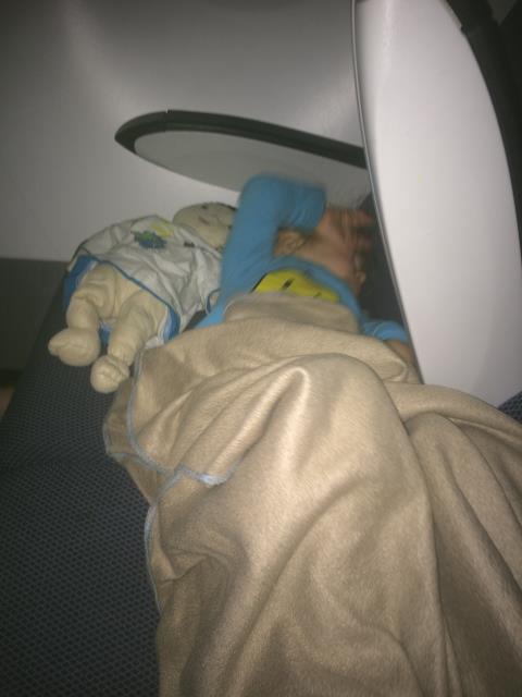 Nachdem es (relativ spät) Abendbrot gab, schlafen die Kinder sehr schnell ein. Aaron hat es sich zwischen den Sitzen auf dem Boden gemütlich gemacht und ich teile mir mit Pauline unsere 3er Sitzreihe. Das klappt ganz gut und die Kinder schlafen durch bis 1.5h vor der Landung. Ich kann auch ganz gut schlafen, so dass dieser lange Flug tatsächlich wie im Flug vorbei geht :-)