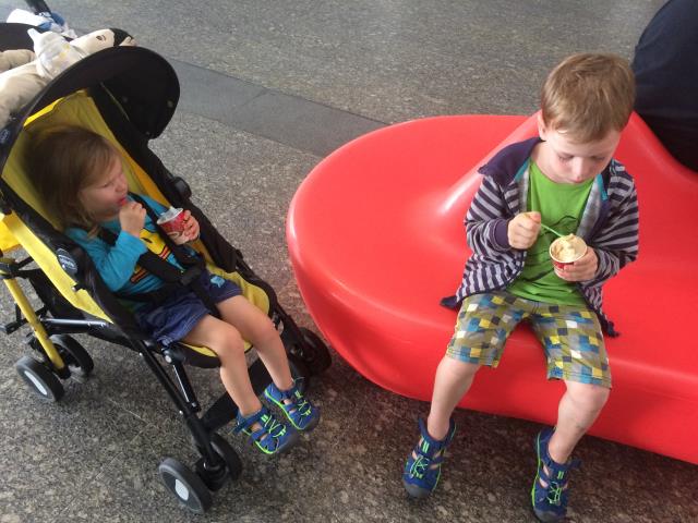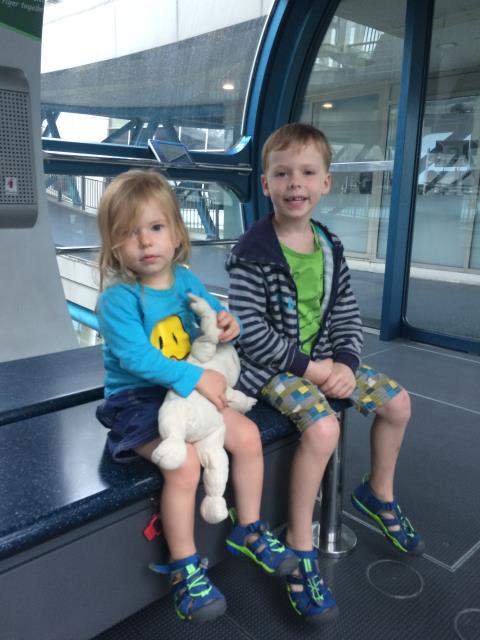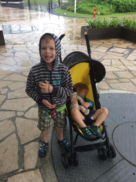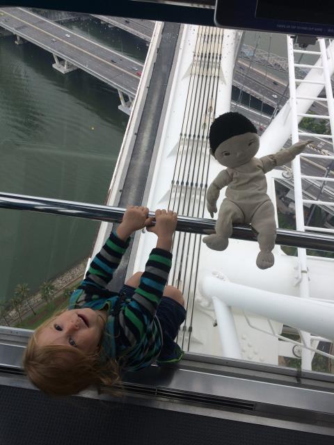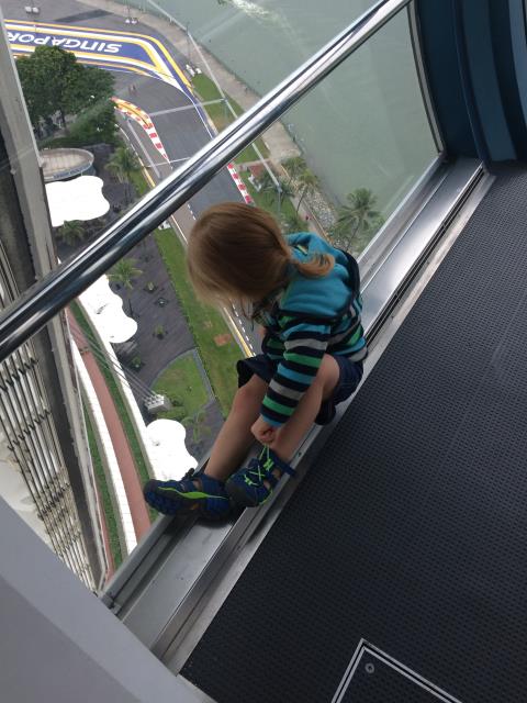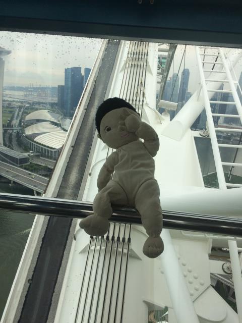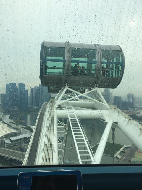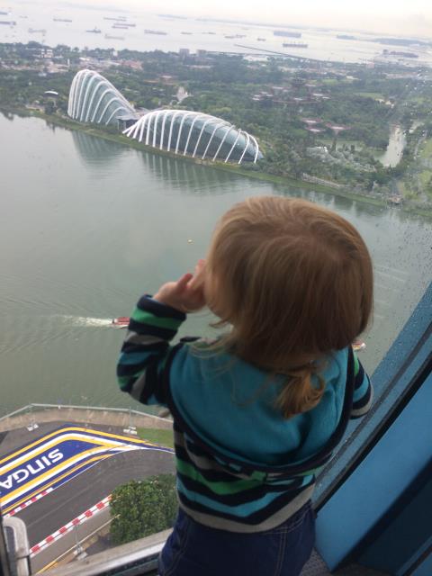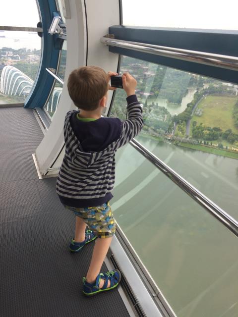 Auf Wunsch von Aaron, wollten wir heute mal eine Runde mit dem Singapur Flyer fahren - dem größten Riesenrad Asiens. Doch leider hatte uns heute das Glück mit dem Wetter verlassen. Zuerst hat es so doll geregnet, dass wir gar nicht von der Metrostation zum Riesenrad laufen konnten und eine ganze Weile in einer Mall festhingen. Als der Regen ein klein bisschen nachließ sind wir schnell rüber geflitzt, aber dort angekommen, zog dann ein Gewitter auf und der Betrieb wurde auf unbestimmte Zeit unterbrochen. Da es aber Aarons größter Wunsch war mit diesem Riesenrad zu fahren und er auch absolut nicht von einem Alternativprogramm zu überzeugen war, warteten wir eine ganze lange Weile lang. Zum Glück hat Pauline die meiste Zeit davon geschlafen. Als sie dann wach wurde und ich gerade beschlossen hatte, nicht länger zu warten und den Kindern als Entschädigung das teuerste Eis der Welt gekauft habe (die kleinste Kugel kostete 5.90$) wurde wieder geöffnet und wir konnten doch noch mit fahren - und hatten wieder einen überglücklichen Aaron :-) Die Fahrt mit dem Singapur Flyer dauert ca 30 Minuten (für genau eine Umdrehung). An der höchsten Stelle ist man ca 160m hoch und hat einen tollen Ausblick auf die Stadt. Allerdings sollte man das eher bei schönerem Wetter machen - wegen der besseren Sicht. Bei uns war es heute leider ziemlich trübe.