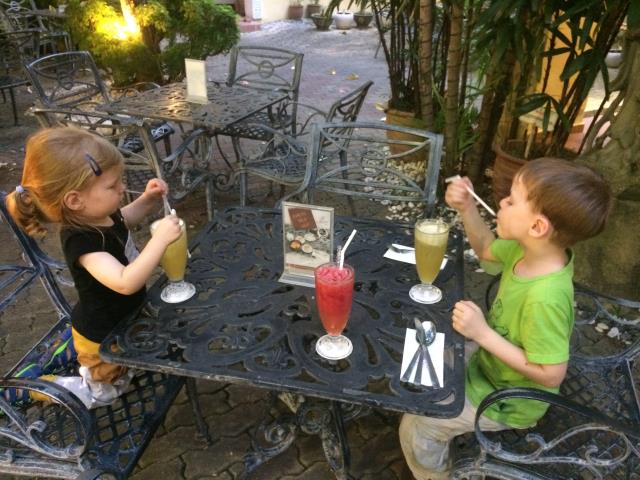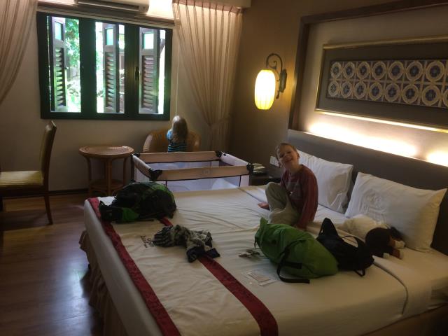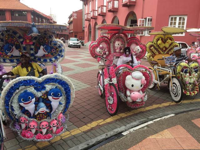 In Melaka kommen wir bei schönstem Sonnenschein an und nehmen vom Busstop ein Taxi zum Hotel. Das Puri Hotel liegt direkt in Chinatown und macht einen sehr netten Eindruck. Beim Einchecken bekommen wir direkt ein Upgrade (mit 2 Kindern kann man ja sicherlich ein größeres Bett und Zimmer gebrauchen :-) Sehr nett, vielen Dank! Nachdem wir ein bisschen im Zimmer entspannt haben, laufen wir noch ein bisschen durch Chinatown und erkunden die Umgebung. Es gibt schon ein paar deutliche Unterschiede zu Singapur. Z.B. zahlen wir jetzt fast alle Preise, die vorher in Dollar waren nun in MYR (Malaysische Ringit), der aber nur ca ein fünftel wert ist. Ausserdem kommt man hier deutlich schlechter mit dem Buggy voran. Die Bürgersteige sind zu eng und es sind ständig Hindernisse im Weg. Morgen werden wir den Buggy wahrscheinlich mal zu Hause lassen.