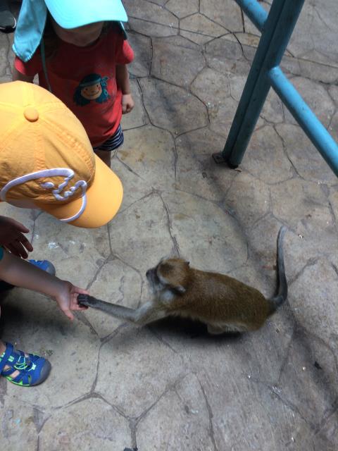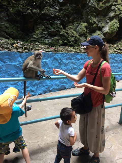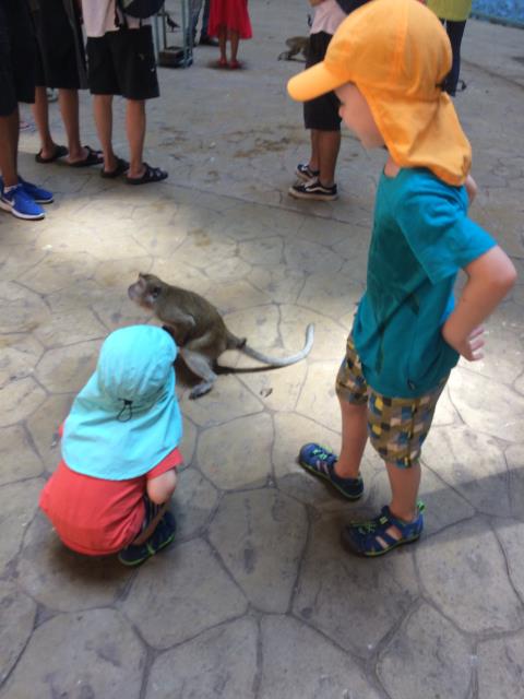Für die Kinder blieben die Affen auch das Highlight unseres Ausflugs und sie hatten kaum Augen für die schönen Tropfsteinhöhlen und bunten hinduistischen Tempelanlagen 😆 Naja, Hauptsache sie hatten ihren Spass :-) Zurück sind wir dann mit dem Zug gefahren. Leider hatten wir gerade einen verpasst und mussten fast eine Stunde auf den nächsten warten (dafür war die Rückfahrt noch mal um die Hälfte günstiger als die Hinfahrt 😁) Beim Warten haben wir zwei Chinesinnen getroffen, die sehr angetan von meinen zwei blonden, blauäugigen Kindern waren. Wir kamen etwas ins Gespräch und ich konnte sogar noch ein paar Brocken chinesisch anwenden. (Immerhin haben sie mich verstanden :-) So verging jedenfalls die Wartezeit recht schnell und wir waren am späten Nachmittag wieder zu Hause - und hatten noch genug Zeit für eine weitere Pool-Runde :-)