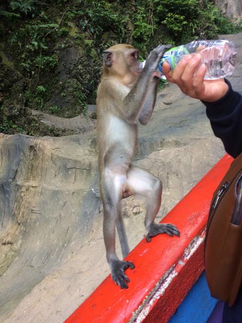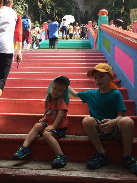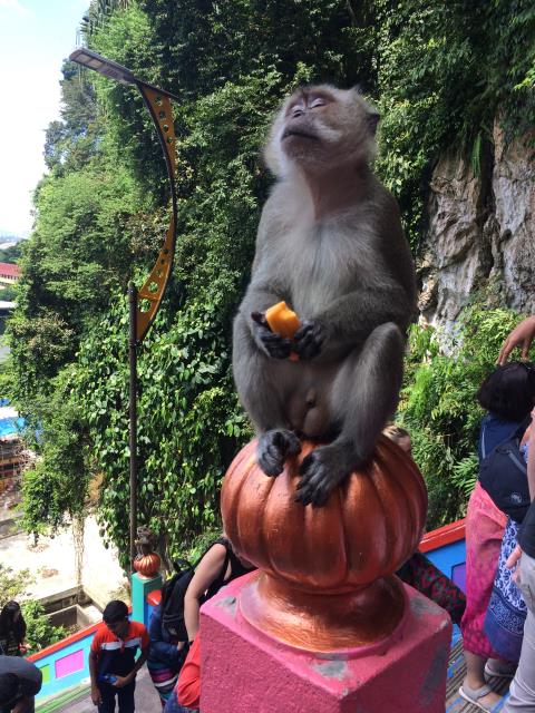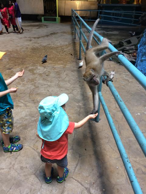 Zum Eingang der Höhle muss man eine ziemlich steile Treppe mit 272 Stufen hochklettern. Und das in der brütenden Mittagshitze! Aber wir haben es langsam angehen lassen und immer wieder Pausen eingelegt - so ging es ganz gut. Ab ca der Hälfte des Aufstiegs tobten dann plötzlich immer mehr Affen auf der Treppe herum, die in den Höhlen und auf dem Berg leben. Ab da war der Rest des Aufstiegs dann ein Kinderspiel. Aaron ist den Affen hinterhergejagt um sie zu fotografieren und selbst Pauline wollte plötzlich alleine laufen :-)