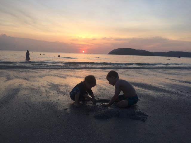 Mal wieder hieß es alle Sachen zusammen packen (mittlerweile schon Routine ;-) und Abschied nehmen von Georgetown und Penang. Für 14 Uhr hatten wir die Fähre nach Langkawi gebucht, die letzte Etappe auf unserer Reise. Vor den Fähren in Malaysia wurden wir ja oft gewarnt und obwohl unsere tatsächlich auch irgendwie wie ein alter Seelenverkäufer aussah, verlief die 3-stündige Überfahrt ganz ruhig und ohne Zwischenfälle. Durch das leichte Schaukeln des Boots sind die Kinder (und ich) ziemlich schnell müde geworden und eingeschlafen und die Zeit verging sehr schnell :-) In Langkawi angekommen, sind wir direkt mit einem Grab zu unserem Hotel am Cenang Beach gefahren, welches auch wirklich direkt am Strand liegt :-) Wir haben dann auch nur schnell unsere Badesachen rausgeholt und sind ab zum Meer - es ist glasklar und warm - jippieh! Zum krönenden Abschluss des Tages durften wir dann auch noch einen wunderschönen Sonnenuntergang erleben. Angekommen im Paradies...