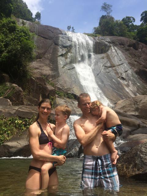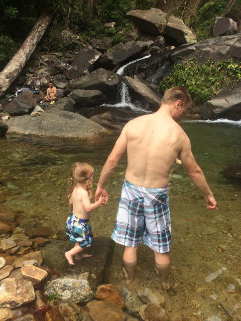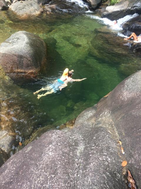 Der Tag heute begann mit leckeren Pancakes und French Toast :-) Anschließend sind wir zum Seven Wells Waterfall gefahren. Man kam mit dem Auto ziemlich nah heran und vom Parkplatz war es nur ein ca 10 minütiger Fußmarsch (allerdings sehr steil durch den Dschungel) zu den unteren Becken. Hier konnte man wunderbar baden und sich abkühlen. Leider waren auch ziemlich viele andere Leute hier unterwegs, das hat dem Spaß aber kaum Abbruch getan. Nach einem ausgiebigen Bad sind wir den Weg am Wasserfall entlang noch weiter hinauf geklettert. Das war in der Hitze schon gut anstrengend, hat sich aber auf jeden Fall gelohnt. Weiter oben gab es noch mal einige Becken zum Baden und einen Wanderweg durch den Dschungel zum Gipfel des Berges. Den Weg sind wir ein ganzes Stückchen gelaufen und dort haben wir oben in den Baumwipfeln sogar die seltenen Brillenlanguren gesehen. Diese sind sehr scheu und man muss schon etwas Glück haben sie zu sehen :-)