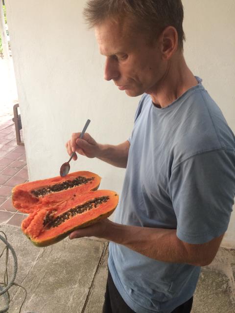 Im Vorgarten steht ein Papaya Baum - da haben wir gleich mal eine geerntet.